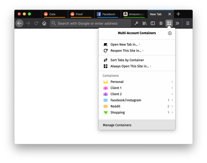 You can replicate facebook container s functionality without an add on by first enabling the feature disabled by default through about preferences general and then you can set privacy usercontext longpressbehavior to 2 if you like.